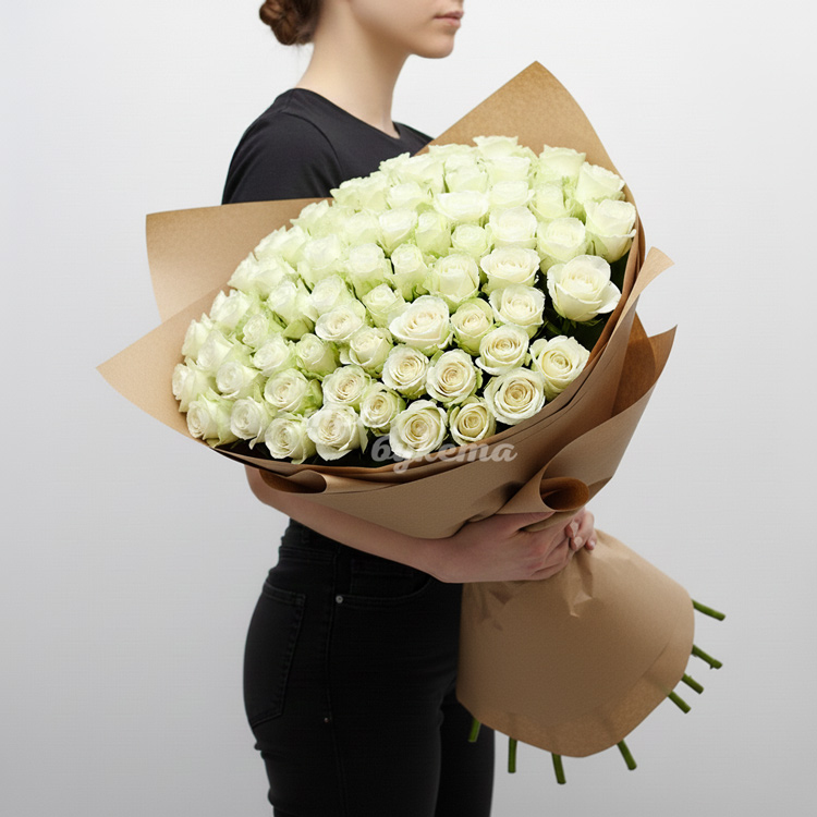 101 белая роза в крафте 70 см