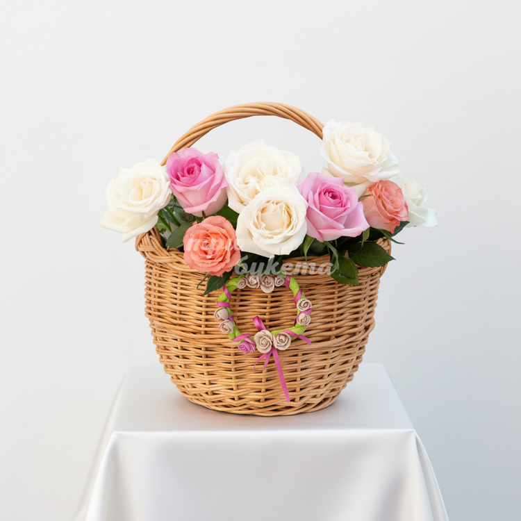 9 разноцветных роз в корзине