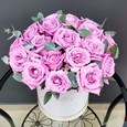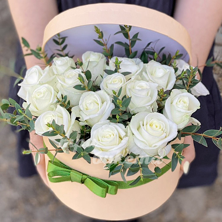 Белые розы с эвкалиптом в коробке