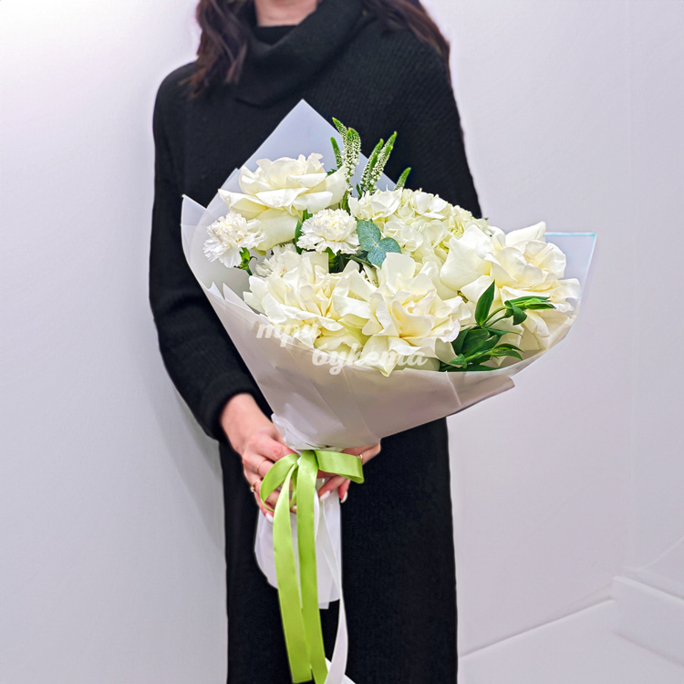 Белый букет роз, гвоздик и гортензии