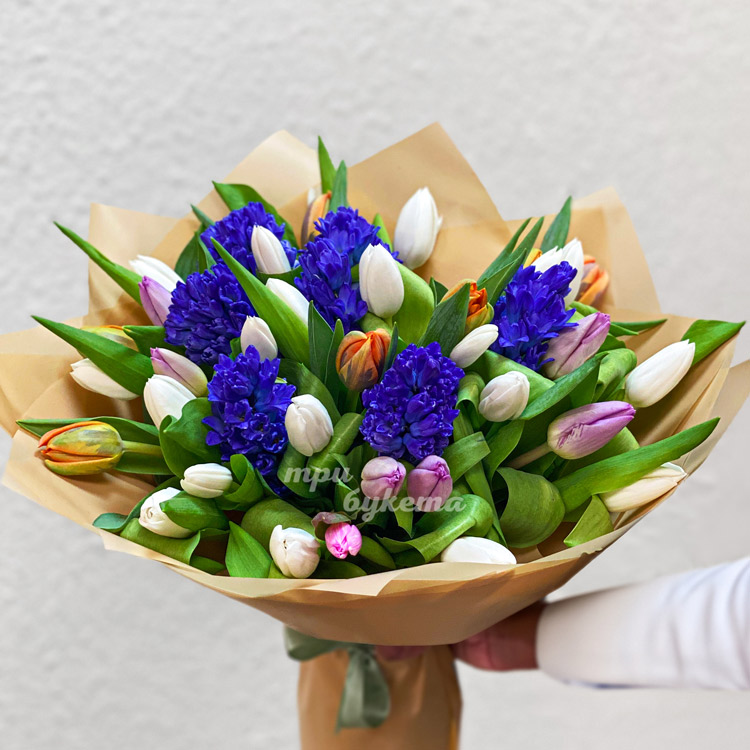 Букет цветных тюльпанов и синих гиацинтов
