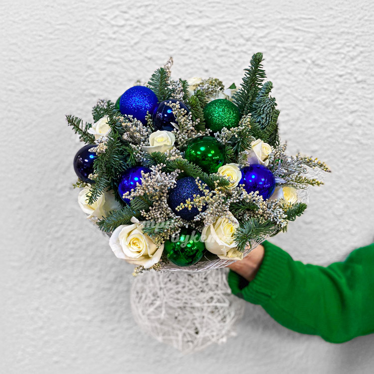 Букет елочных шаров с белыми розами