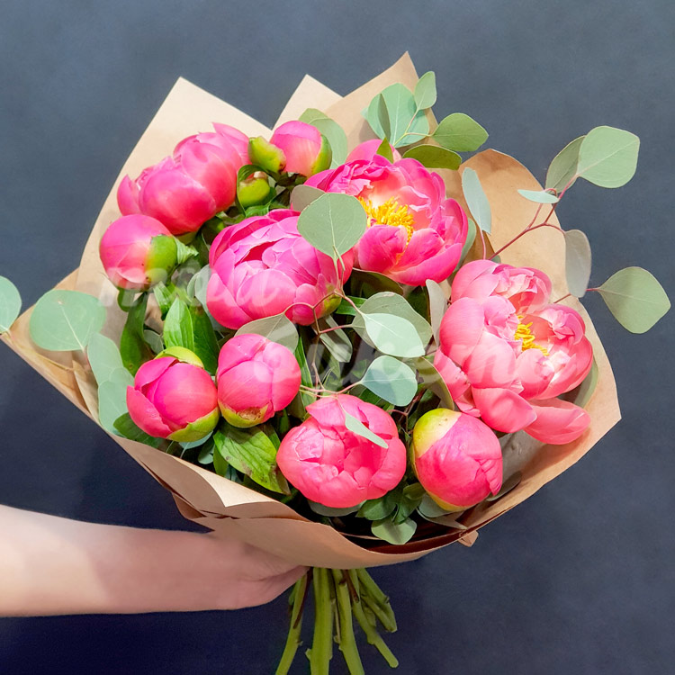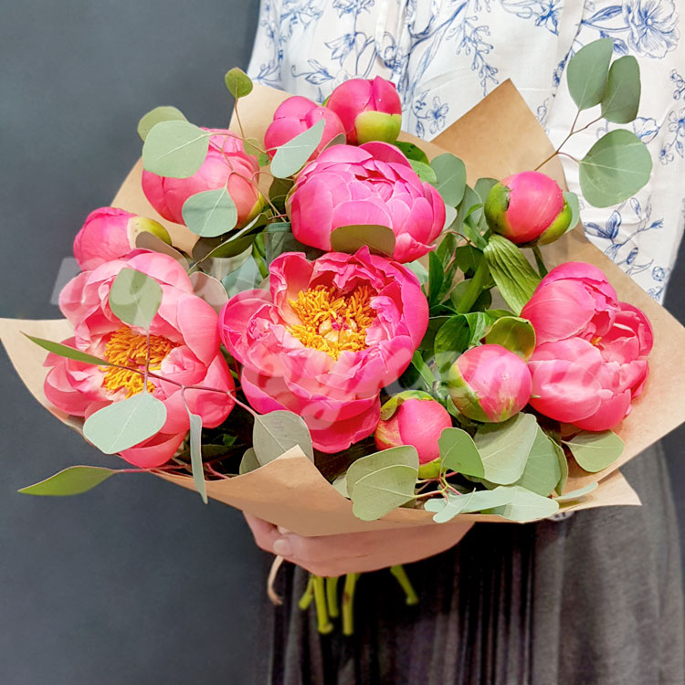 Букет из 11 розовых пионов в крафте