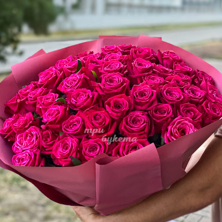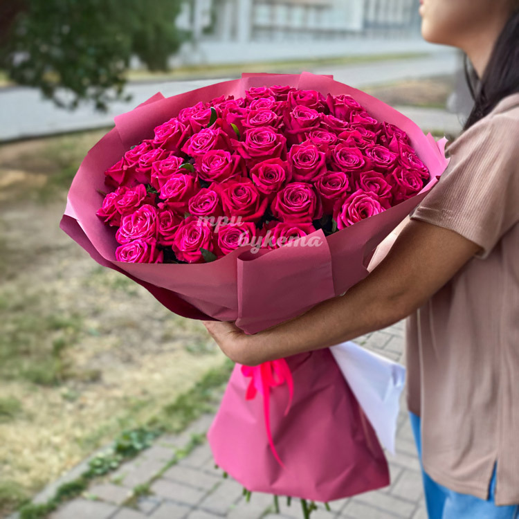 Букет из 51 высокой розы цвета Фуксия