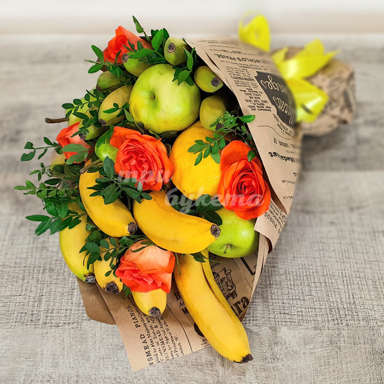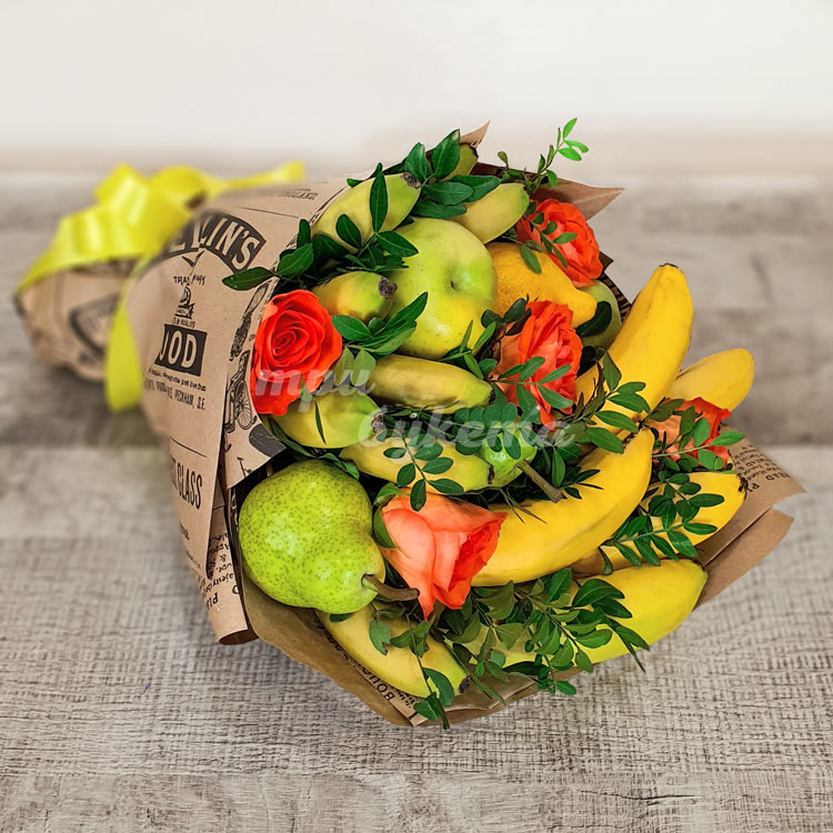 Букет из бананов, яблок, груш и роз