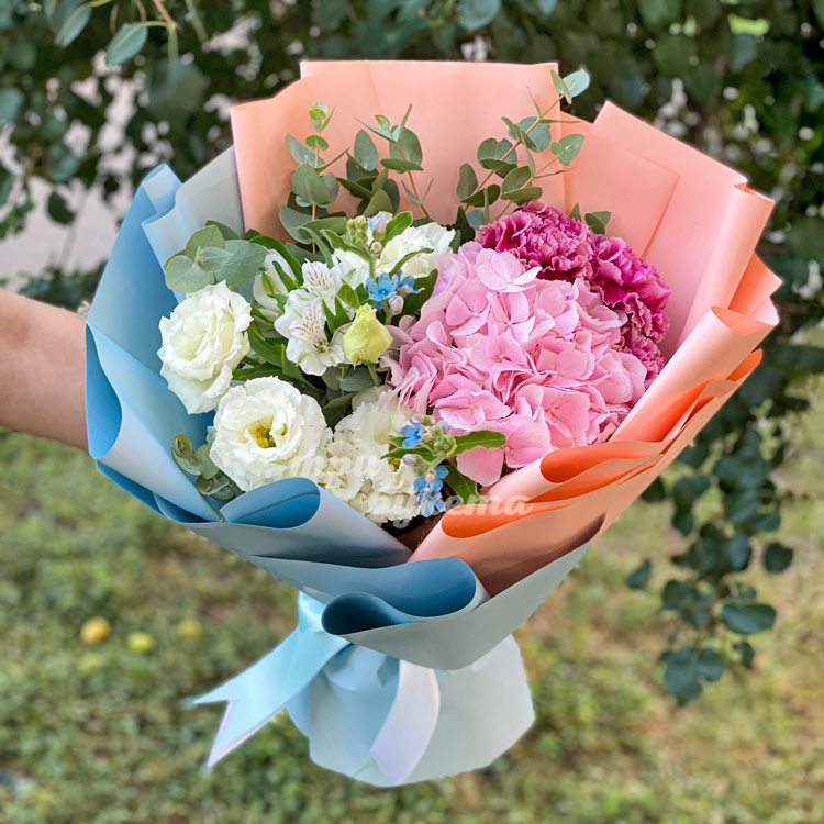 Букет из гортензии и эустомы