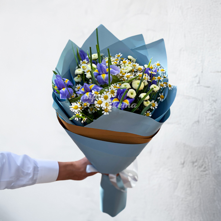 Букет из ирисов, ромашек и хризантем