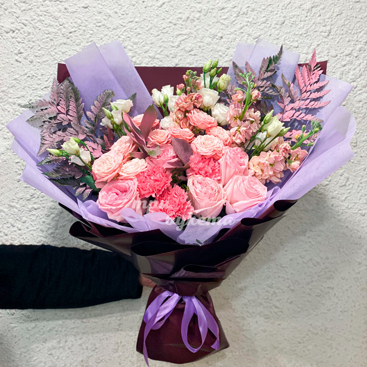 Букет из роз, гвоздик и папоротника