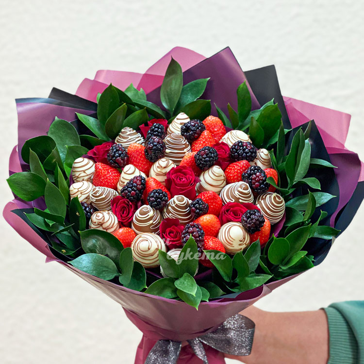 Букет клубники в шоколаде с красными розами