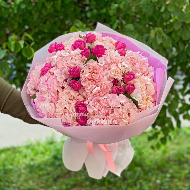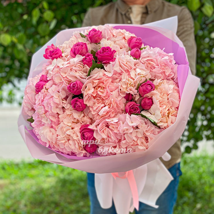 Букет коралловых гортензий и розовых роз