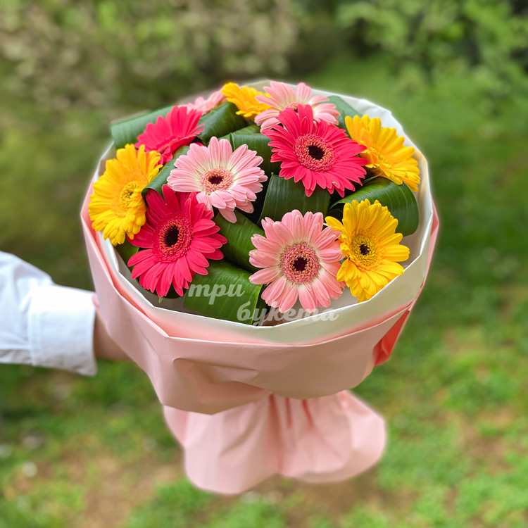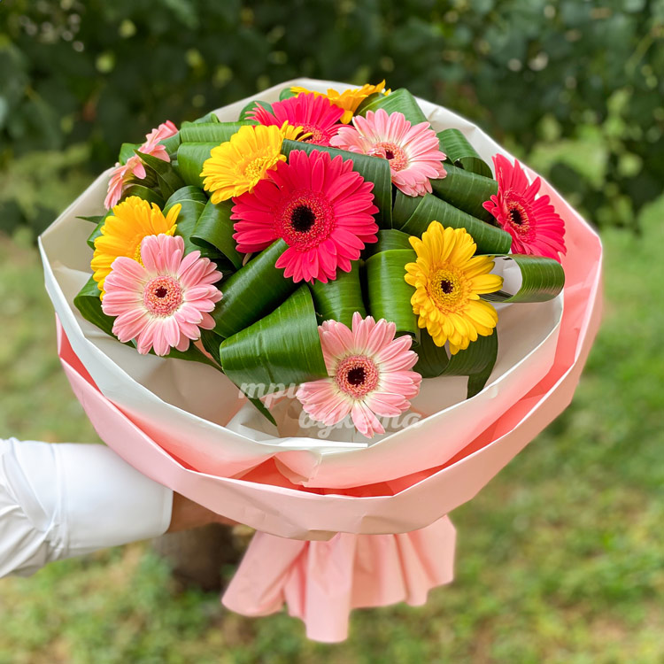 Букет разноцветных гербер с зеленью