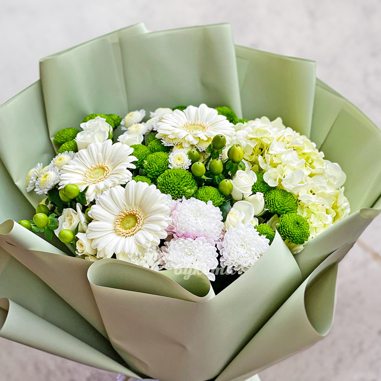 Букет с белыми герберами и гортензией