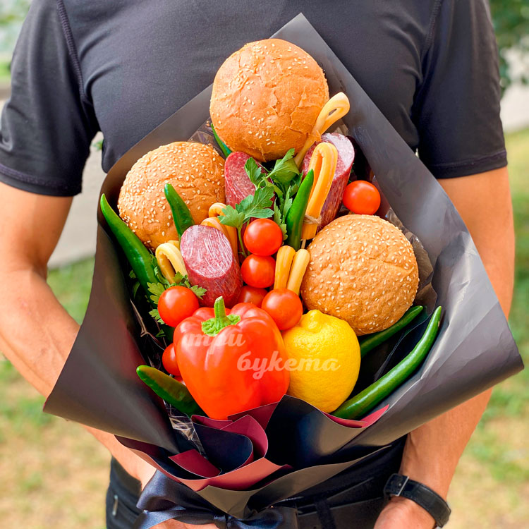 Букет с булками, колбасой и овощами