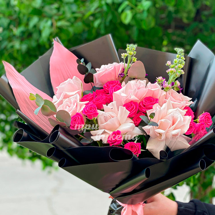 Черный букет из розовых роз и маттиолы