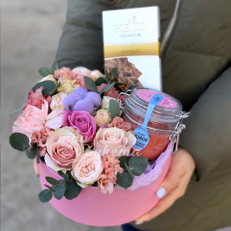 Цветы и сладости в коробке для мамы