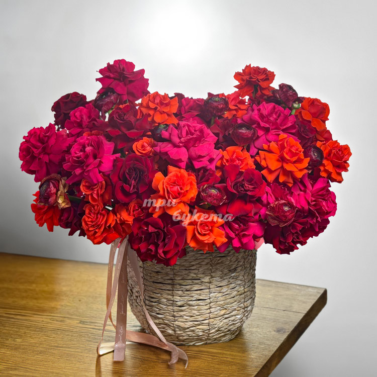 Кашпо бордовых, розовых и оранжевых роз
