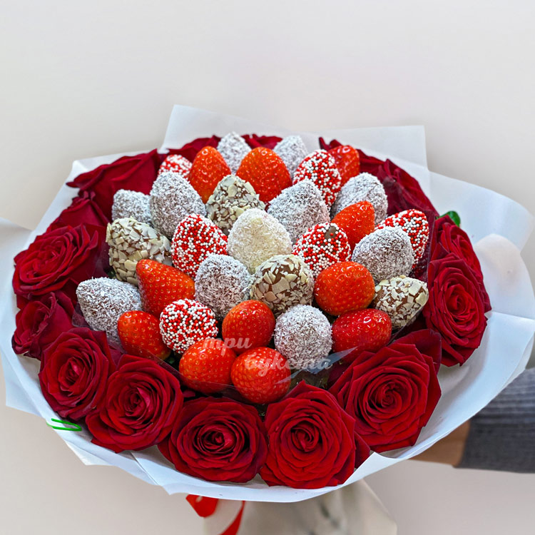 Клубника и 15 красных роз в букете