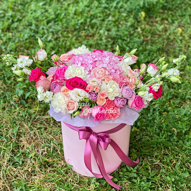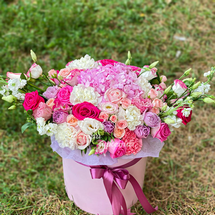 Композиция ярких цветов в шляпной коробке