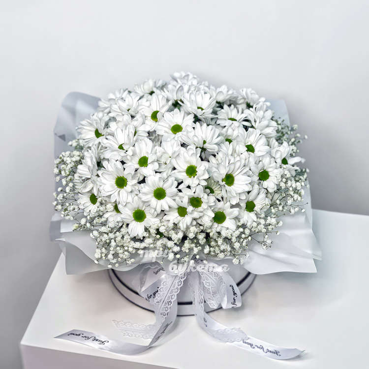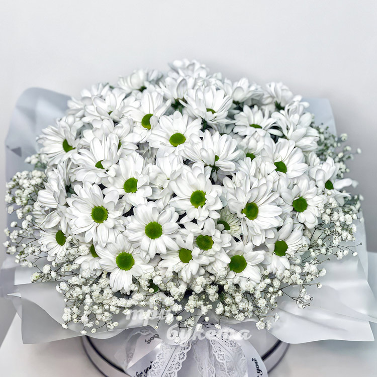 Коробка белых хризантем и гипсофил