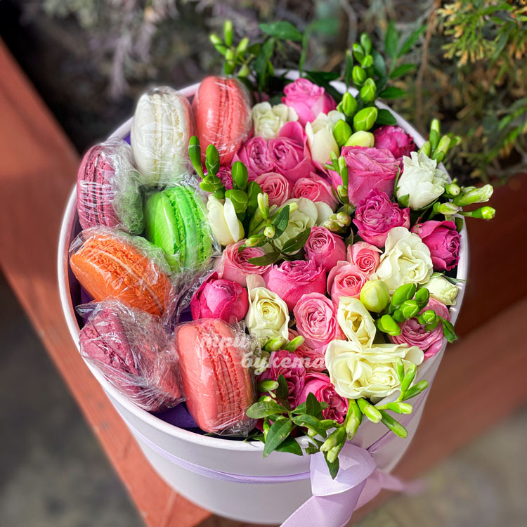 Коробка макарун с розами и фрезиями