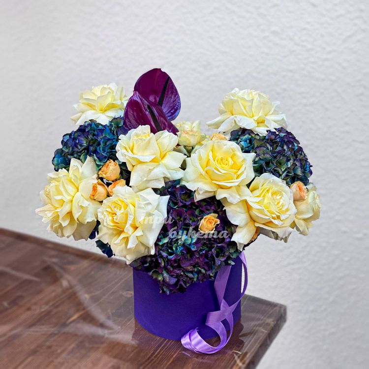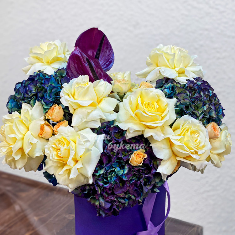 Коробка окрашенных гортензий и французских роз