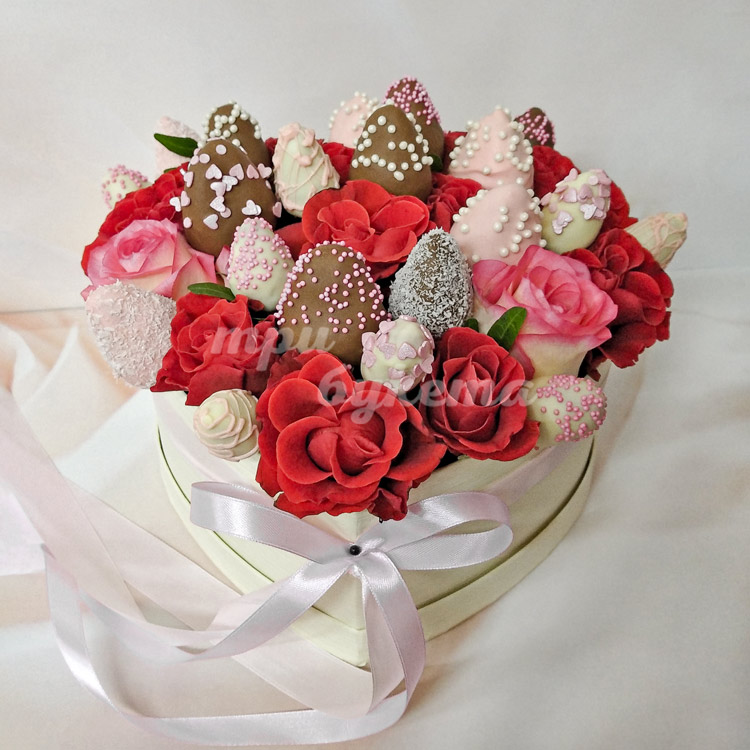 Коробка-сердце с клубникой и розами
