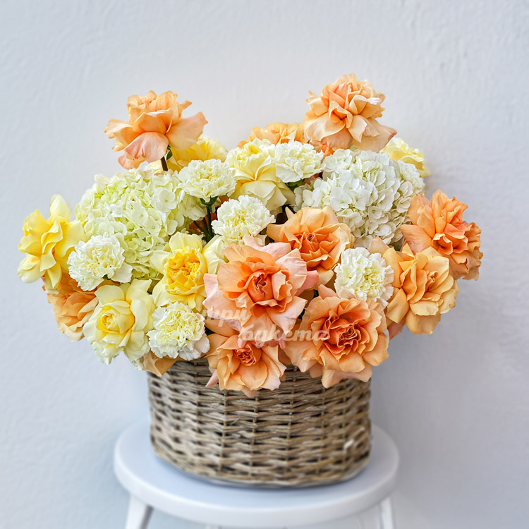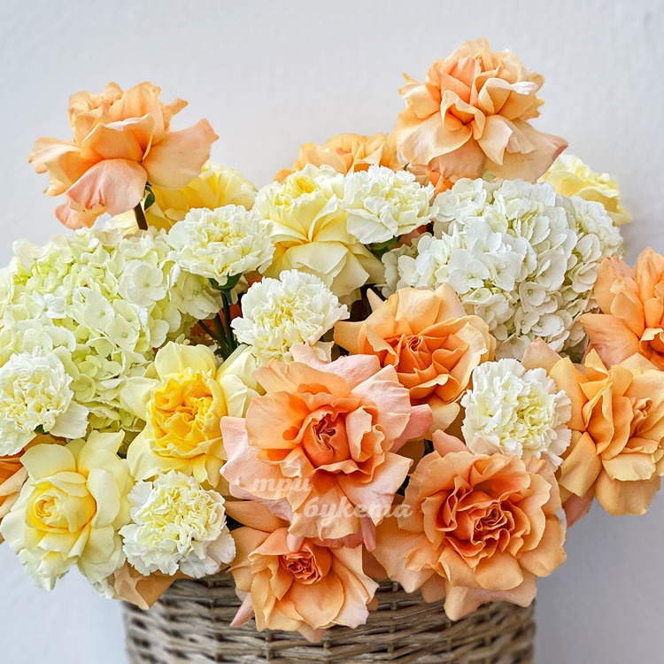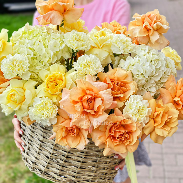 Корзина французских роз, гвоздик и гортензий
