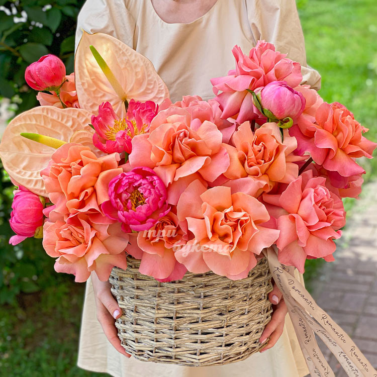 Корзина коралловых роз и розовых пионов