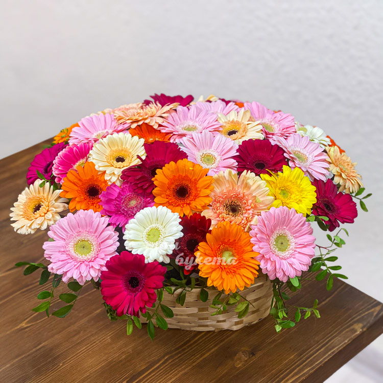 Корзина разноцветных гербер с фисташкой