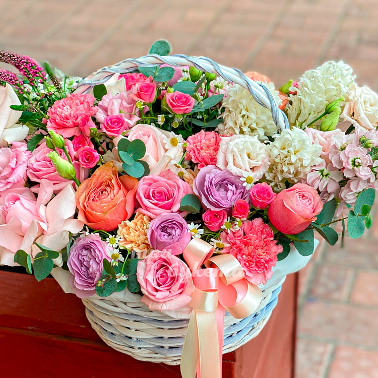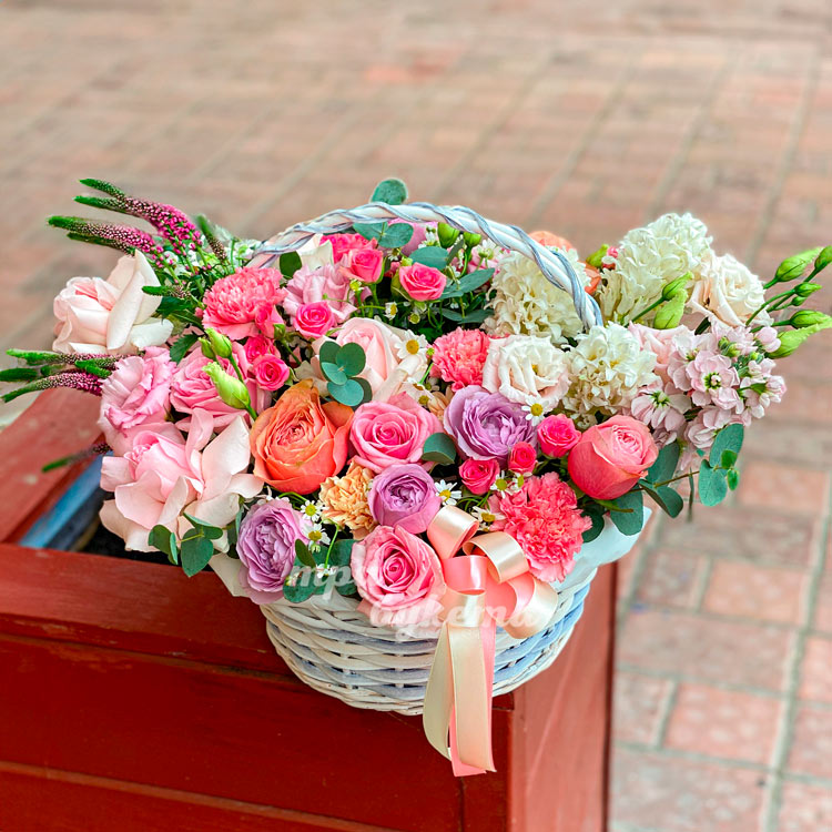 Корзина розовых роз, гвоздик и гиацинтов