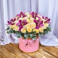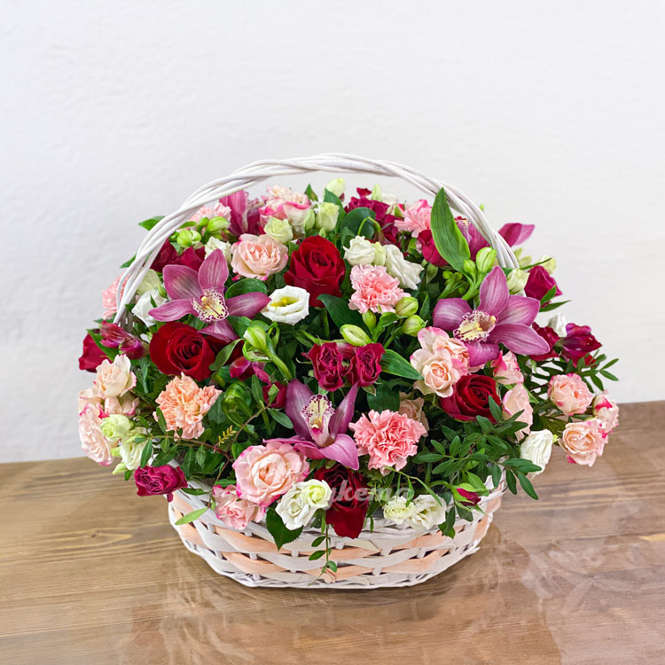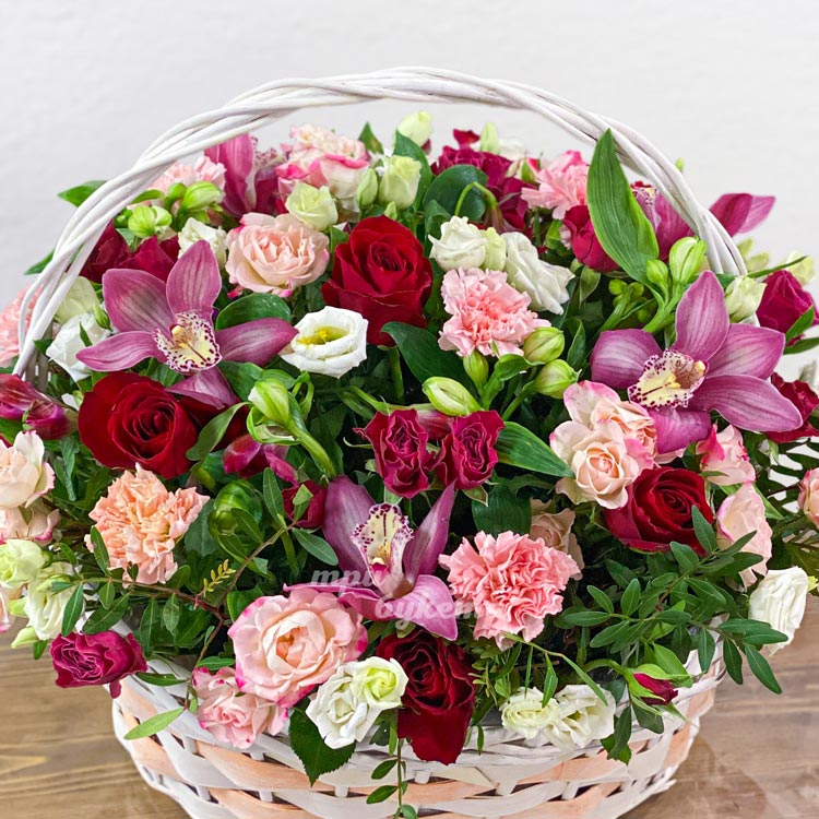 Корзина ярких роз, гвоздик и орхидей