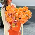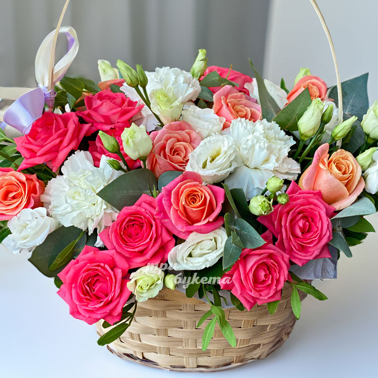 Корзина ярких роз и белых гвоздик