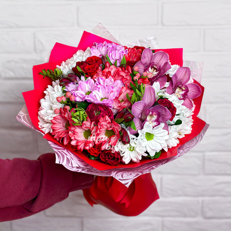 Красный букет из хризантем, орхидей и роз