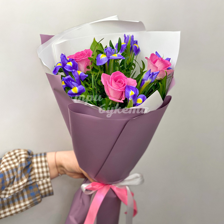 Небольшой букет роз и ирисов