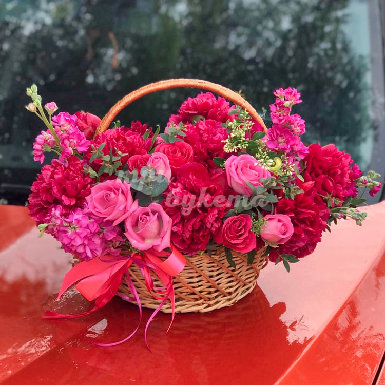 Пионы, маттиолы и розы в корзине
