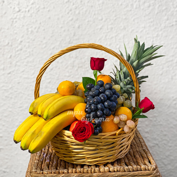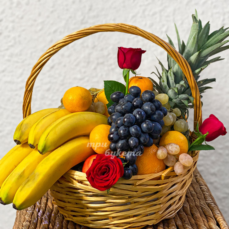 Подарочная корзина фруктов с красными розами