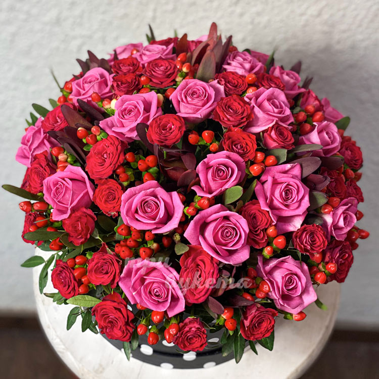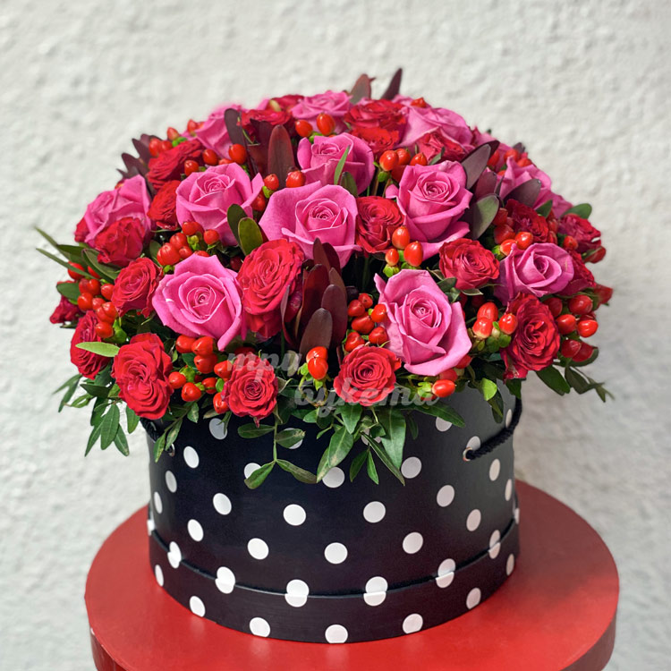 Пурпурные розы с гиперикумом в коробке