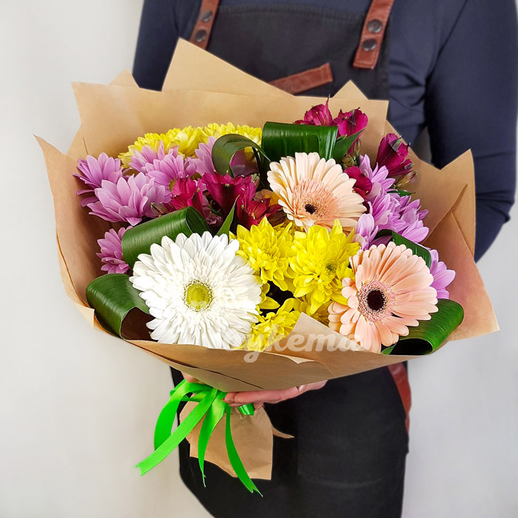 Разноцветные хризантемы и герберы