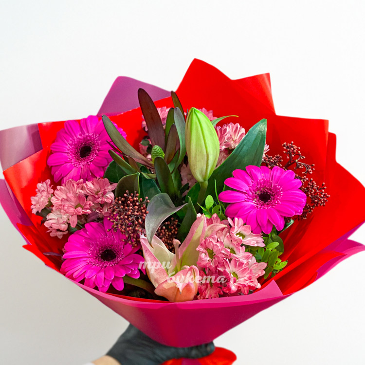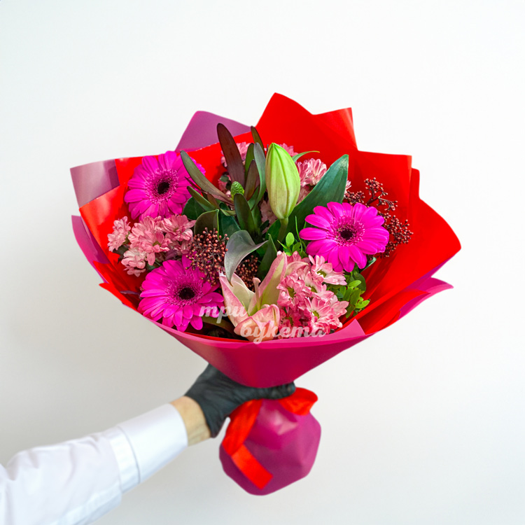Розовый букет гербер, хризантем и лилий