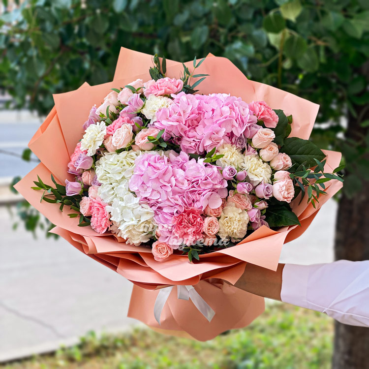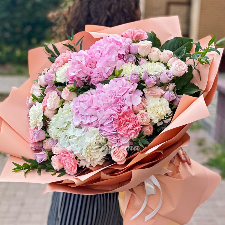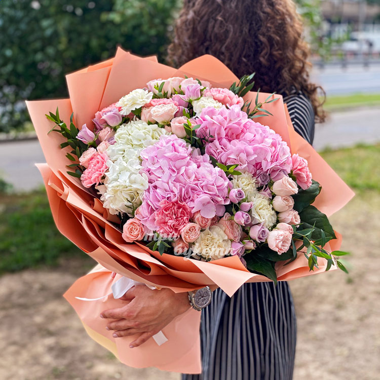 Розовый букет гортензий и кустовых роз