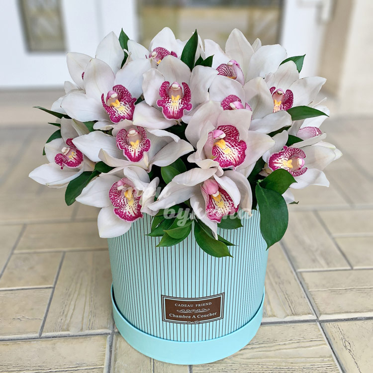 Шляпная коробка с 20 белыми орхидеями