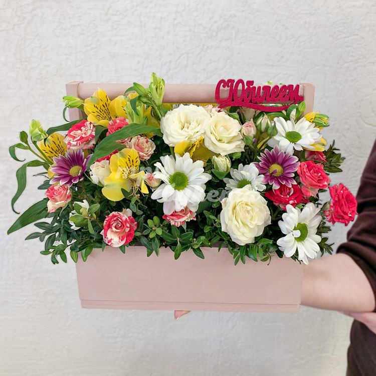 Ящик хризантем, альстромерий и роз